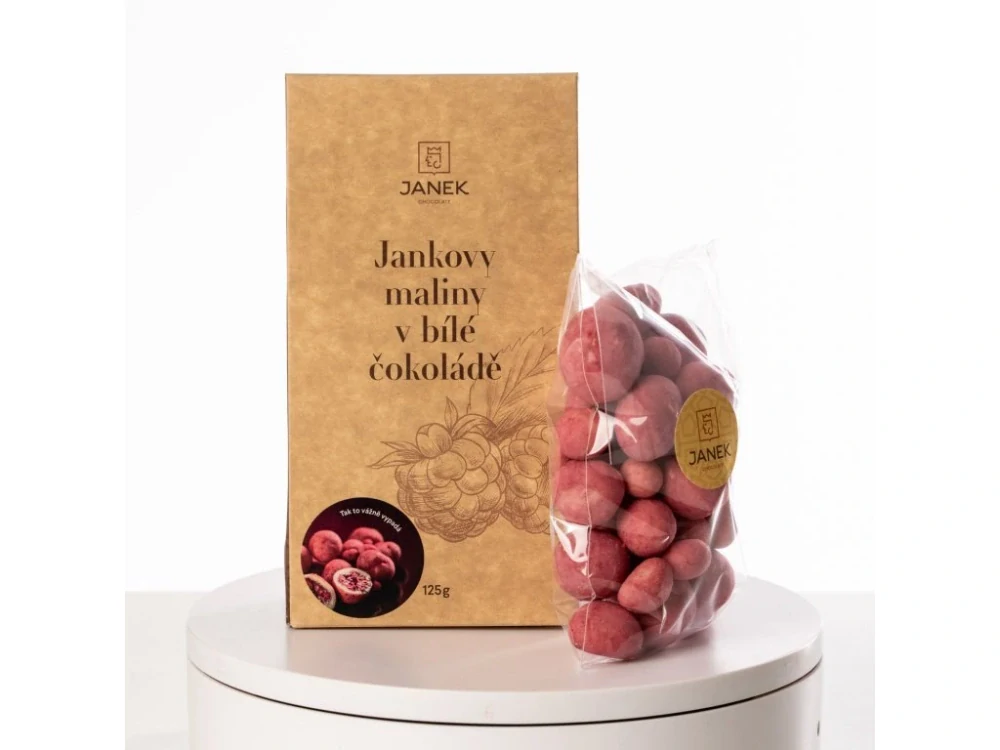 JANKOVY maliny v bílé čokoládě 125gSkladem275 Kč/ ks246 Kč bez DPH