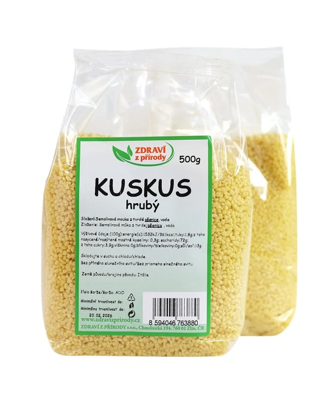 Kuskus se vyrábí ze sušené pšeničné krupice a je ideální pro rychlé vaření. Vhodný je jako příloha nebo součást zeleninových jídel a salátů, konzumuje se teplý nebo studený.