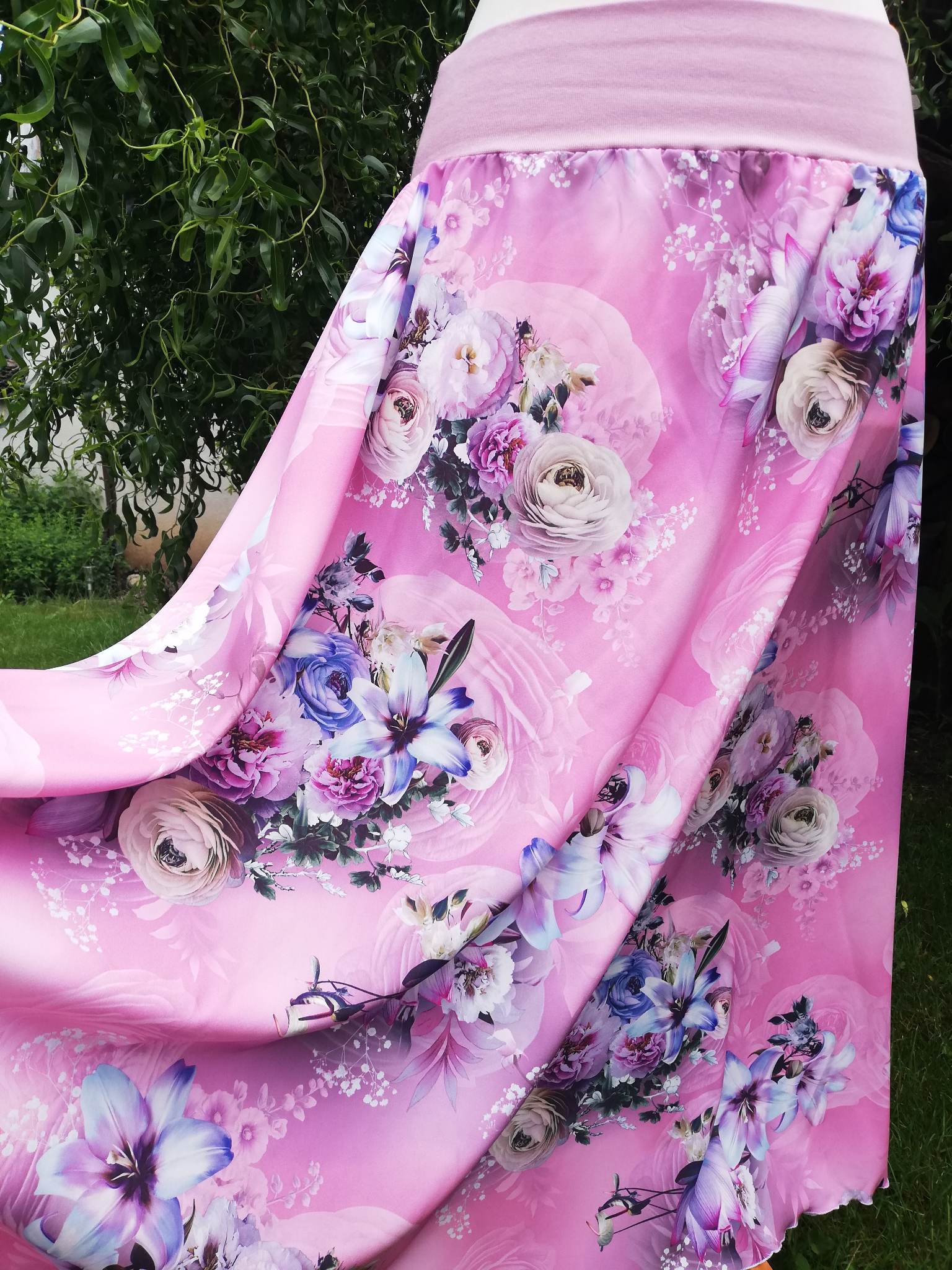 Sukně všech délek z imitace hedvábí. V pase do příjemného nápletu . pojištěno měkkou gumkou. Střih půlkolovka. Cena mini do 50 cm 690 Kč