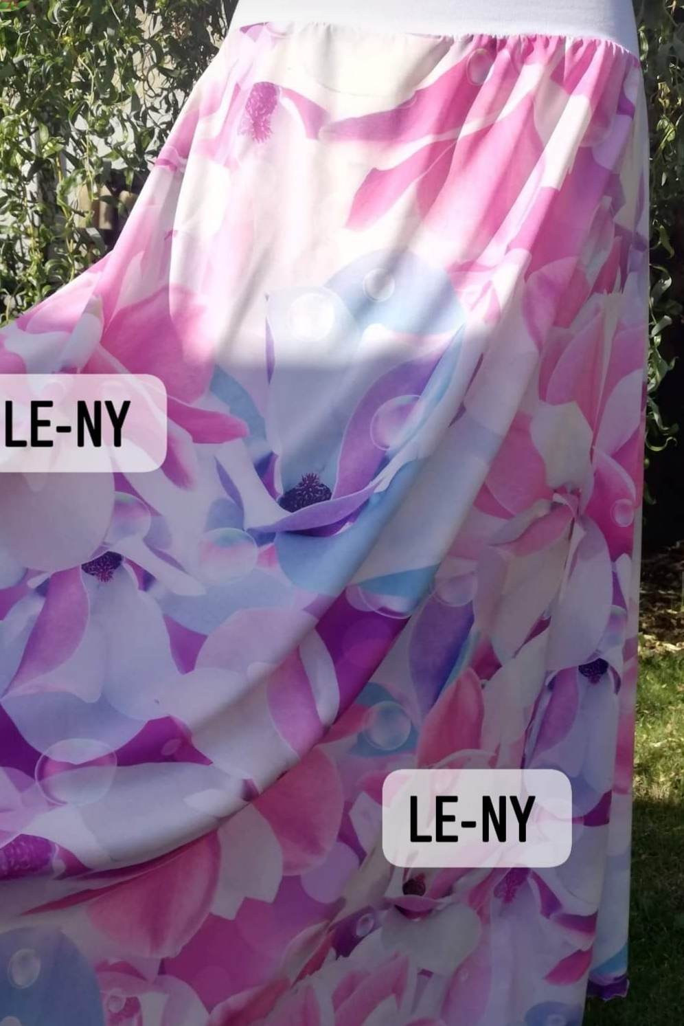 Sukně všech délek z imitace hedvábí. V pase do příjemného nápletu . pojištěno měkkou gumkou. Střih půlkolovka. Cena mini do 50 cm 690 Kč