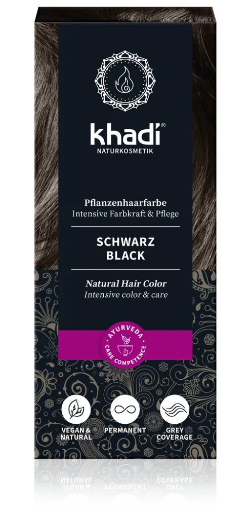 Rostlinná barva na vlasy Khadi ČERNÁ barví vlasy černě, s lehce teplým tónem. Výsledný tón závisí na přirozené barvě Vašich vlasů. Tato vlasová barva dodává vlasům zároveň hedvábný lesk a více objemu.
