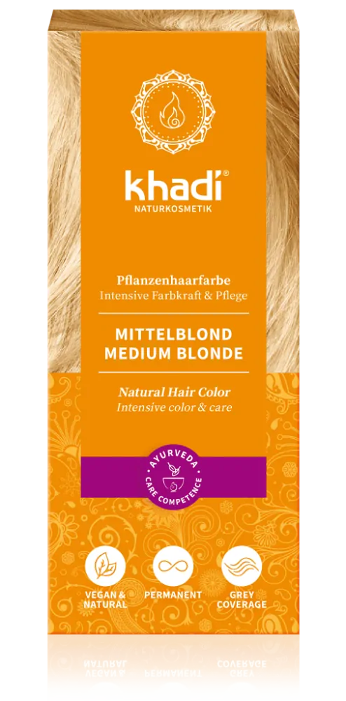 Khadi odstín STŘEDNÍ BLOND dává vlasům přirozeně působící, zářivou barvu. Zároveň o vlasy intenzivně pečuje a dává jim objem.