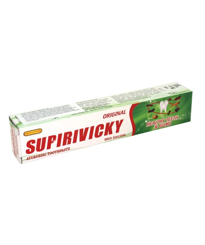 Supirivicky je mnohem víc než jen zubní pasta, obsahuje více než 10 prospěšných ajurvédských ingrediencí. Chrání ústní dutinu, preventivně působí na vznik zubního kazu, regeneruje dásně, přírodně bělí zuby, působí proti zubnímu plaku a má mnohé další blahodárné účinky.